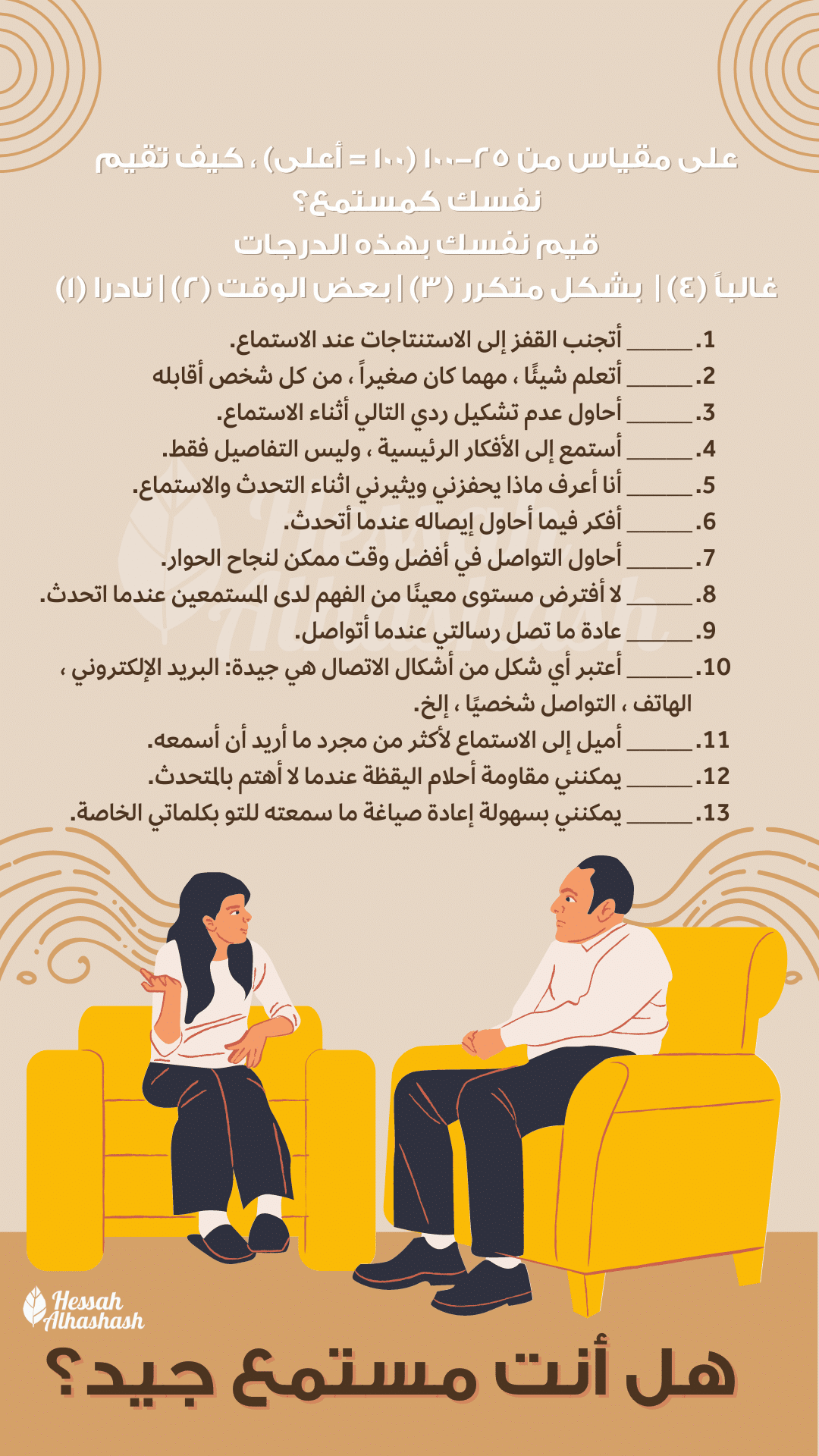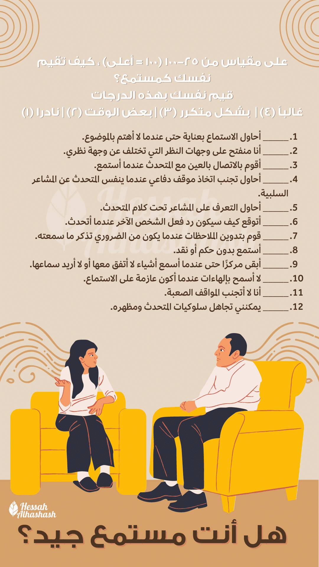 - 75-100 = أنت مستمع ممتاز ومتواصل. استمر.